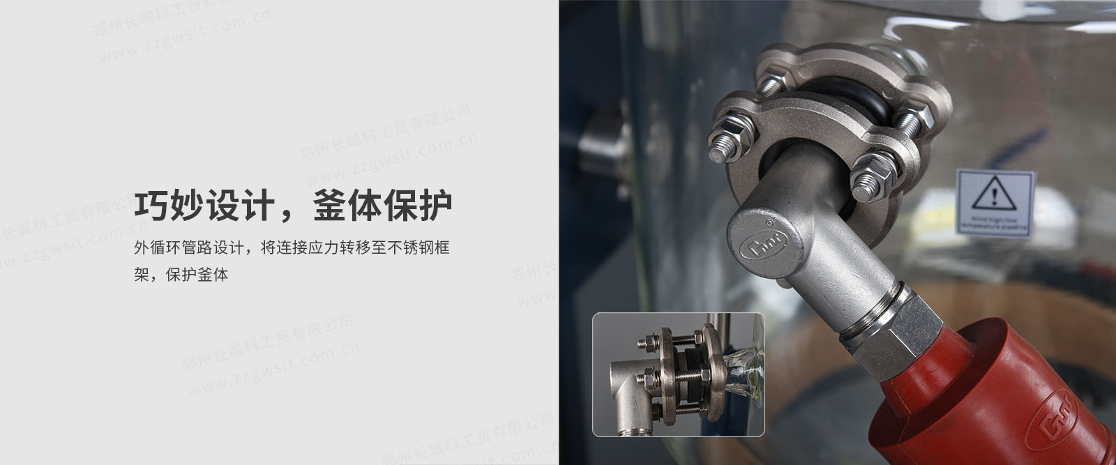 ● 夾套進、出液口連接不銹鋼保溫軟管,減少進出液口應力。